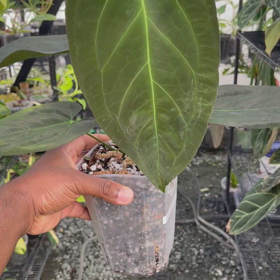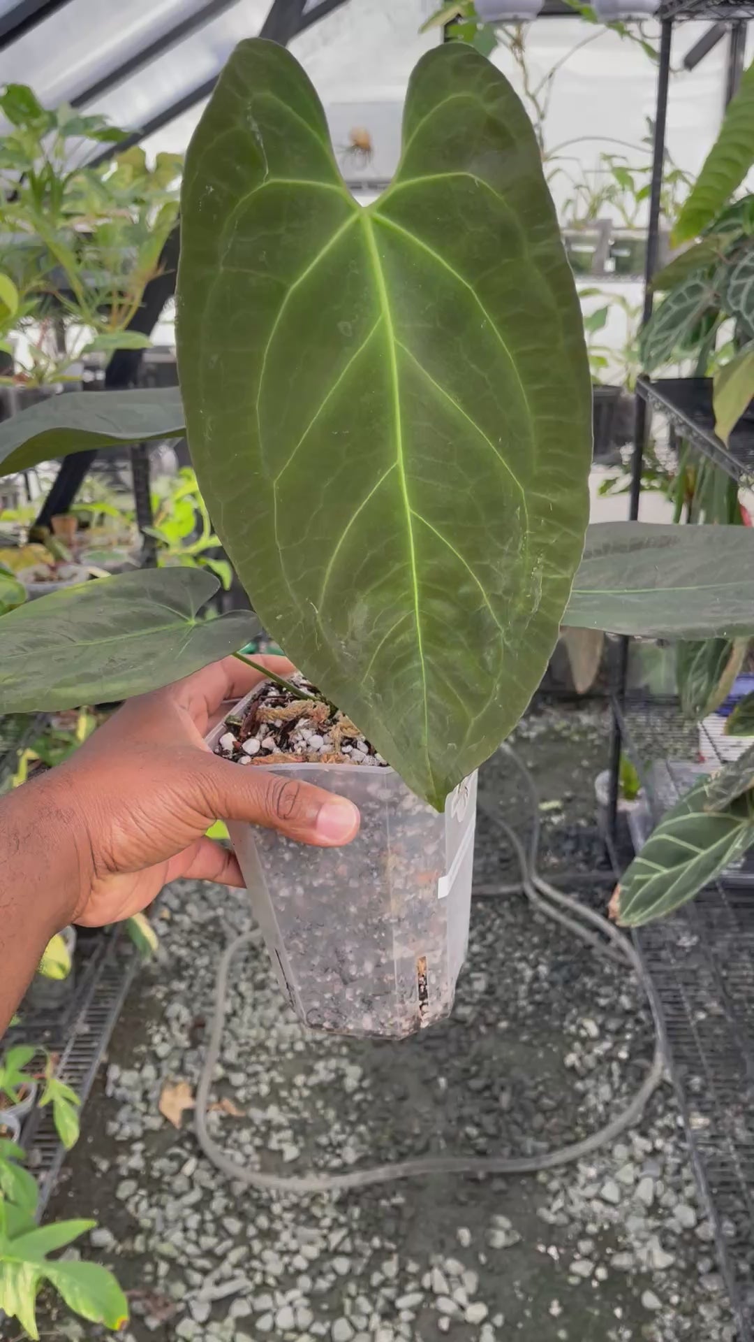Beautiful Anthurium Ree Papillilaminum in a 4”pot. This large specimen is a clone/offset of our Ree Papillilaminum x self mother plant. Simply stunning! With velvety dagger shaped leaves.