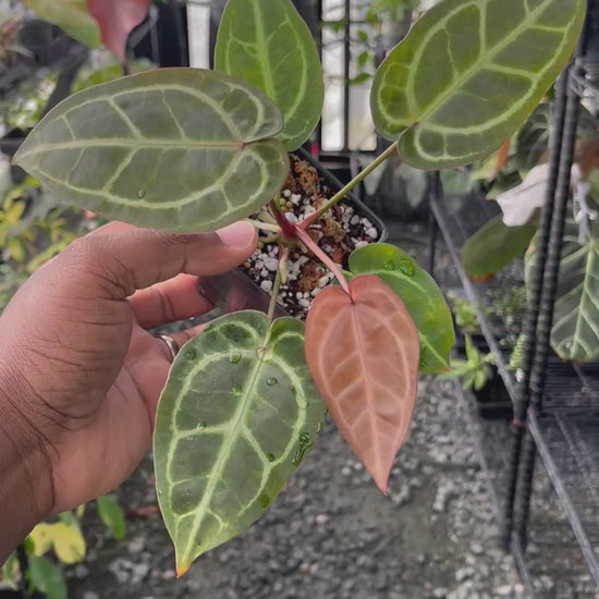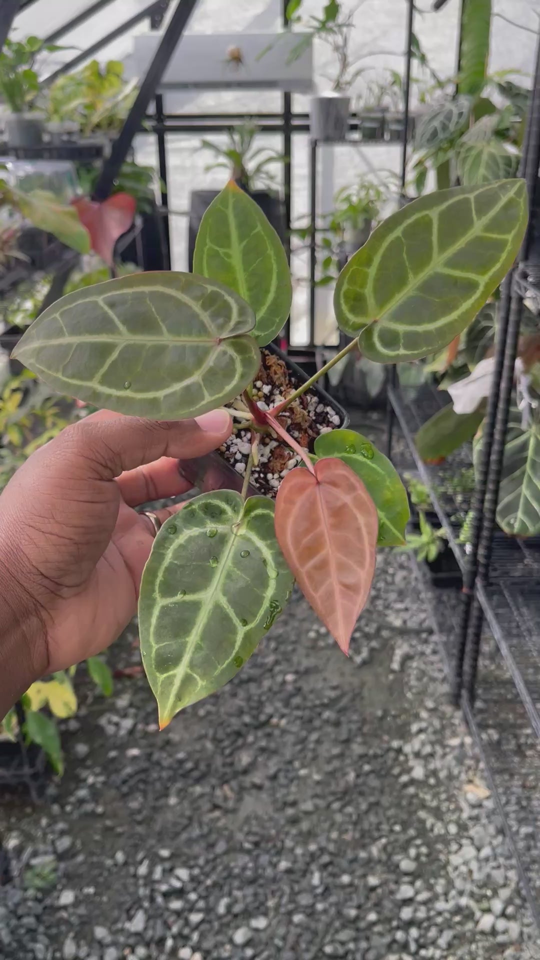 Beautiful Anthurium Tim Anderson Cinnamon Swirl x Tim’s Black x self. This wonderful hybrid has beautiful bright veins. Dark velvety leaf, with orange/ copper emergents! (Plant of similar size and color will be selected for the customer.)